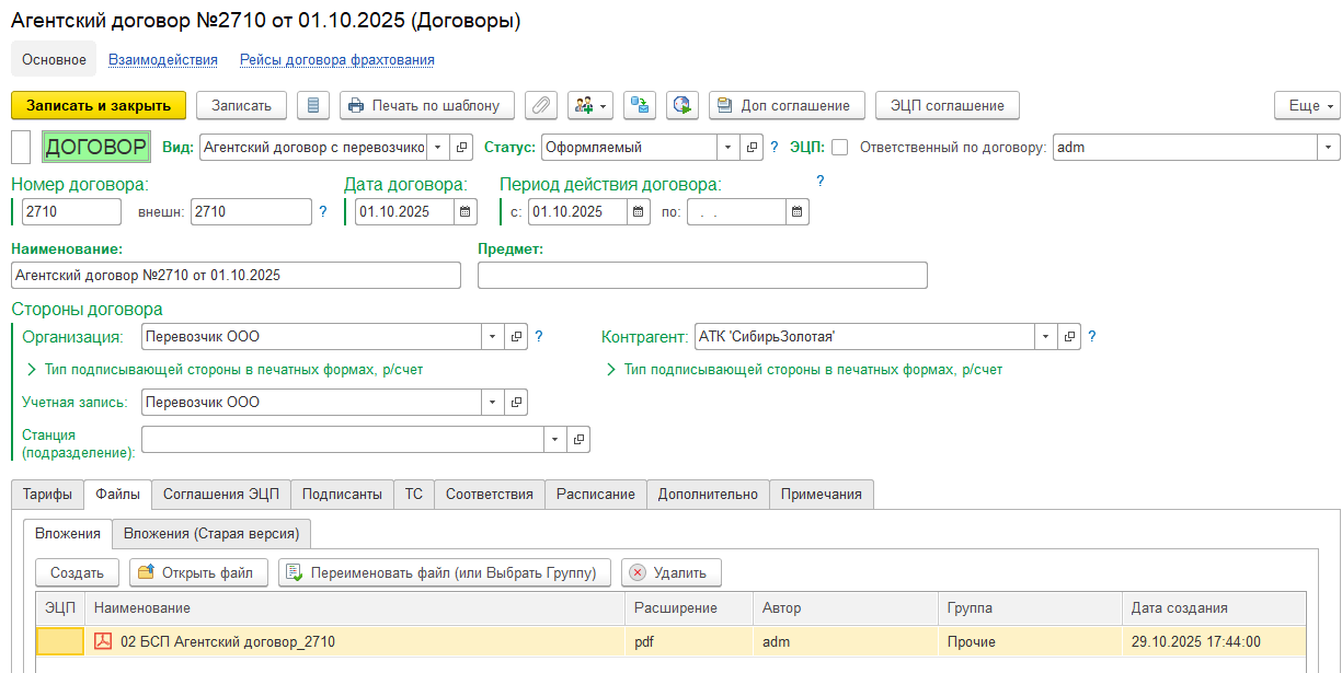 На данной вкладке формируется и хранится печатные формы документов, таких как договор или дополнительное соглашение. Прежде чем формировать файлы, убедитесь, что заполнена вкладка "Подписанты".