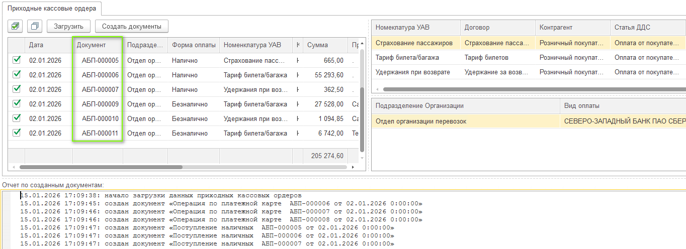 Соответственно, при загрузке в "1С:Бухгалтерия", будут сформированы документы "Поступление наличных" и "Операция по платежной карте".