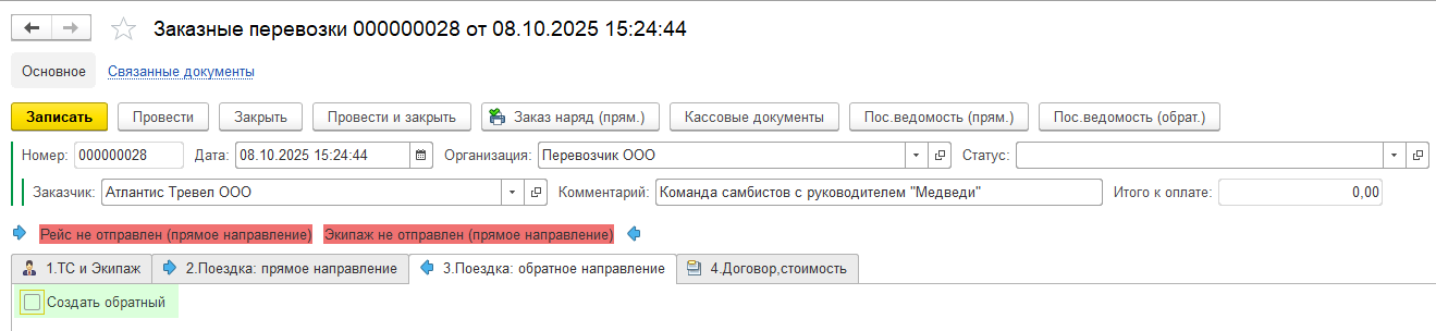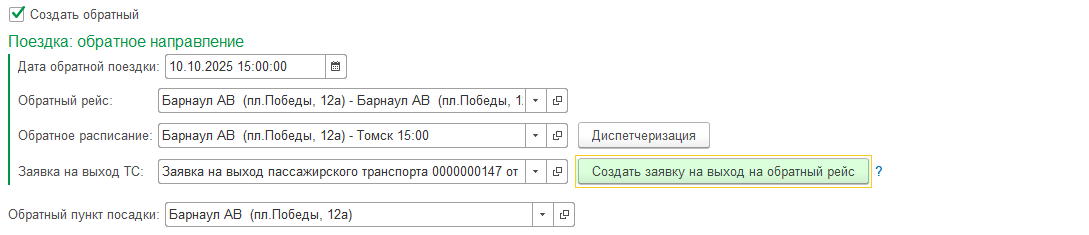 В табличной части укажите дату и время обратной поездки. Нажмите кнопку "Создать обратный рейс".