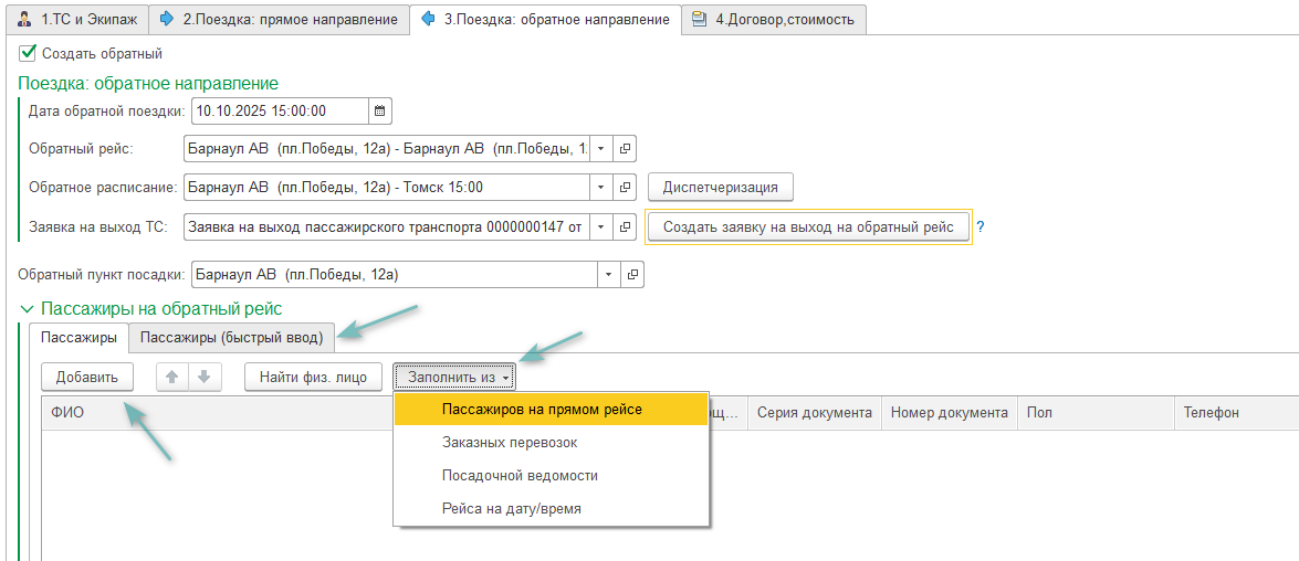 После заполнения списка пассажиров нажмите кнопку "Создать ведомость на обратный рейс".