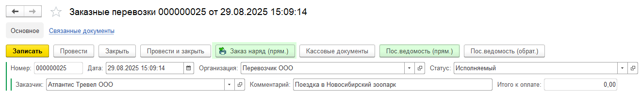 Для водителя необходимо распечатать заказ-наряд в трех экземплярах, а так же посадочную ведомость. Обе печатные формы находятся в шапке документа.