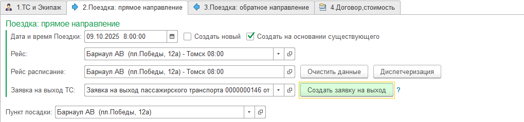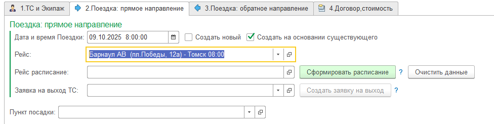 Укажите дату и время Поездки, установите отметку на "Создать на основании существующего". Из выпадающего списка выберите нужный рейс. Чтобы увидеть полный список рейсов нажмите ссылку "Показать все".