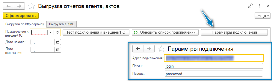 Меню Агентская деятельность - Выгрузка отчетов агента, актов. Нажмите на кнопку Параметры подключения.