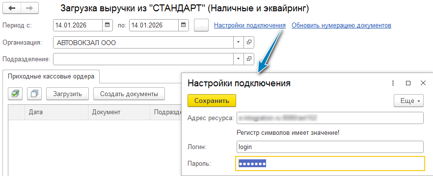 Настройка параметров подключения для обработки "Загрузка выручки из "СТАНДАРТ".