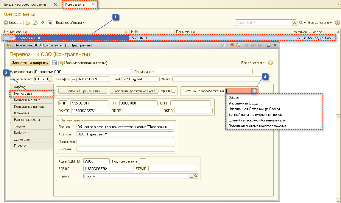 2) Выбираем закладку "Регистрация" и, нажав на кнопку выбора (...), выбираем систему налогообложения.