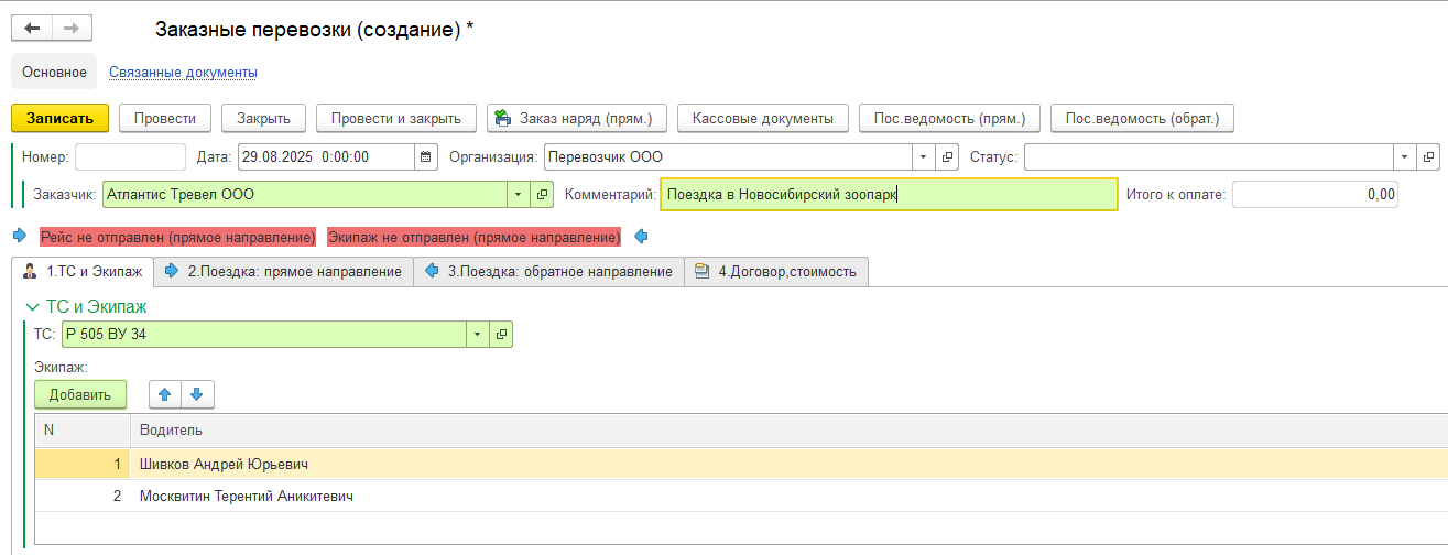 Для водителя необходимо распечатать заказ-наряд в трех экземплярах, а так же посадочную ведомость. Обе печатные формы находятся в шапке документа.