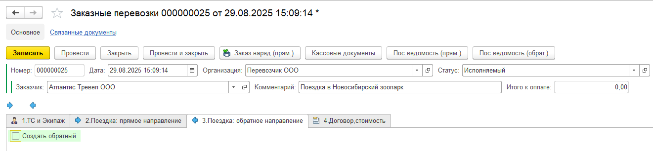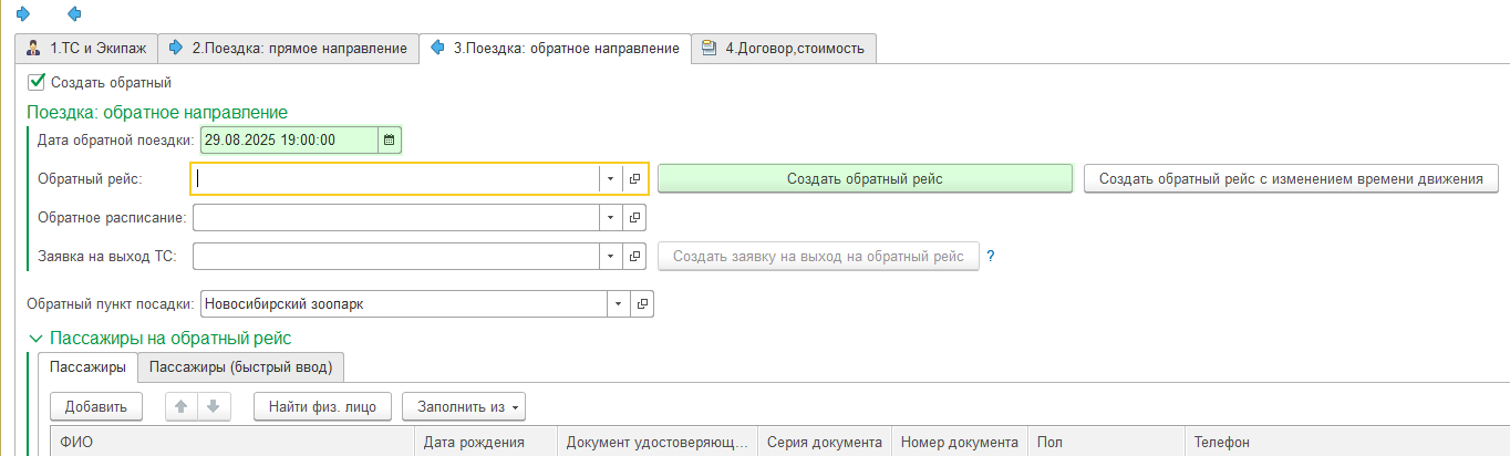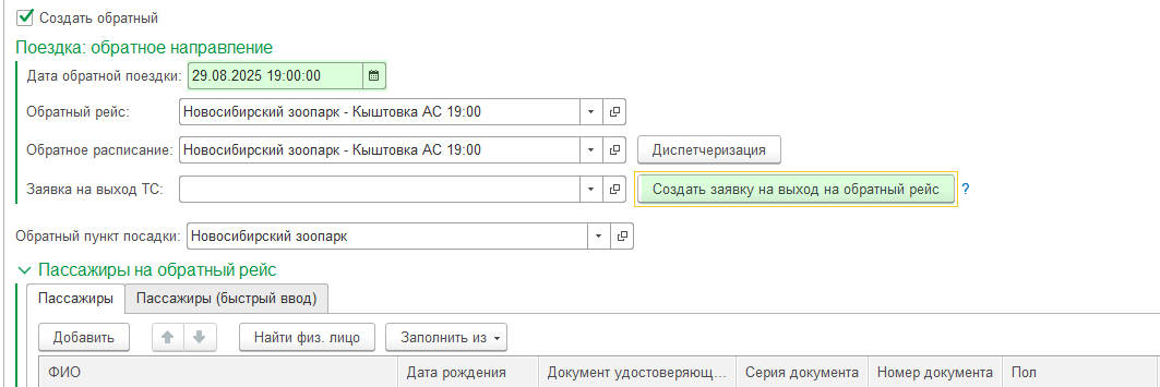 В табличной части укажите дату и время обратной поездки. Нажмите кнопку "Создать обратный рейс".