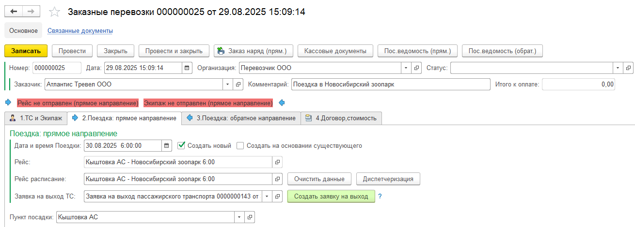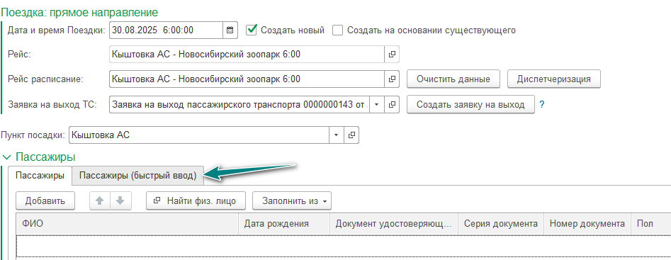 После этого Вы увидите, что строки "Рейс" (наименование) и "Рейс расписание" (дата и время выхода) заполнились.