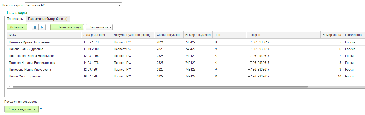 Таблица с пассажирами заполнена, назначены посадочные места.