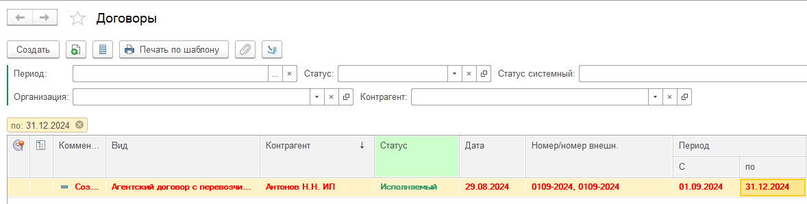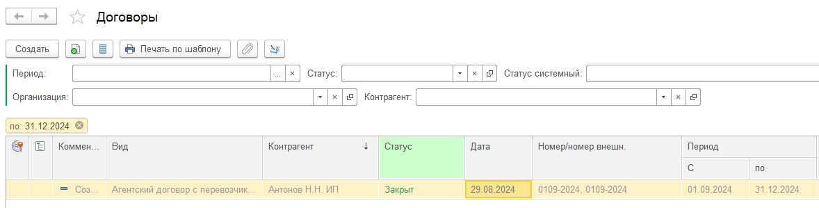 В списке договоров этот договор будет иметь специальную бледно-серую окраску и статус "Закрыт".