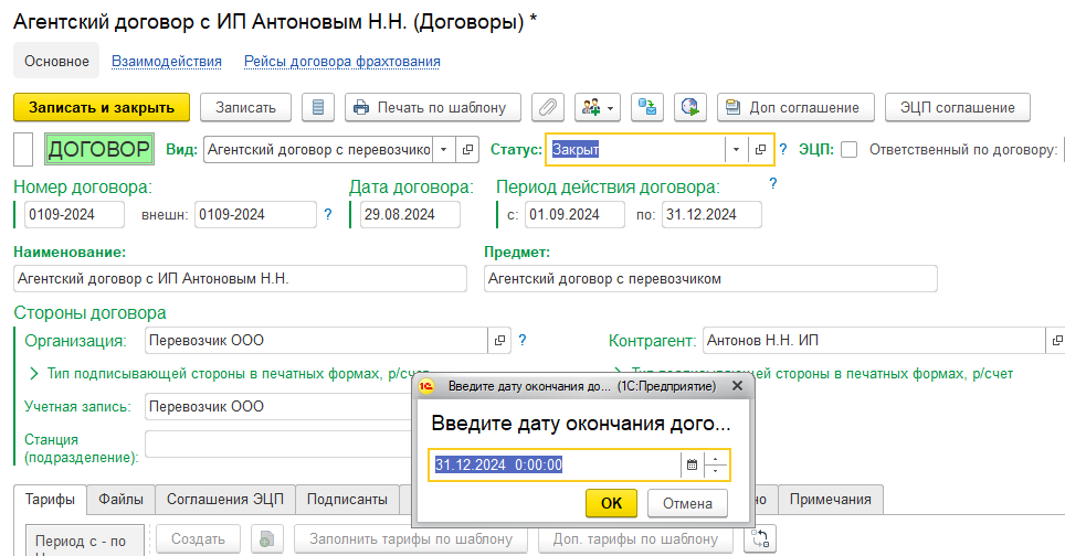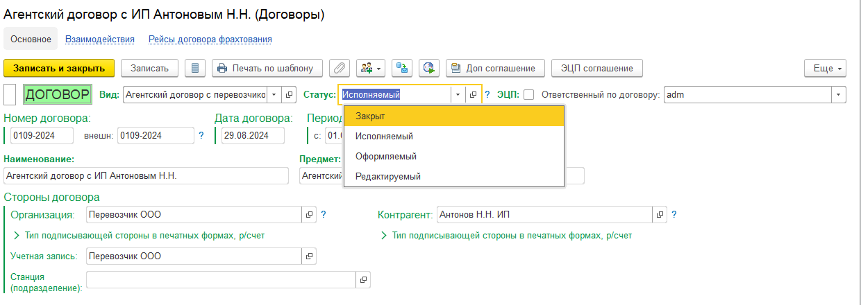 Откройте договор. Если в договоре уже проставлен последний день действия договора, то достаточно изменить статус на "Закрыт".