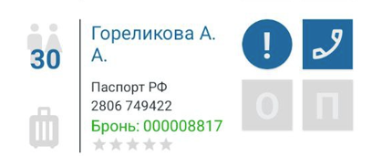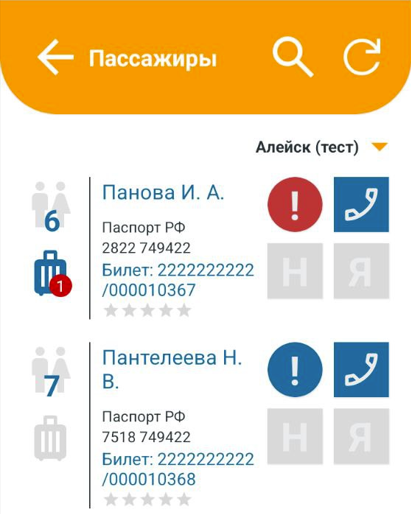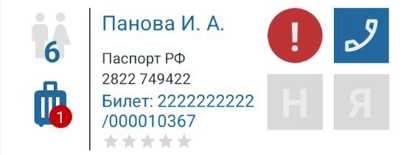 В списке видны ФИО пассажира, сведения о документе удостоверяющем личность. Если по пассажиру имеется дополнительная информация от диспетчера/кассира, то кнопка информация будет подсвечена красным цветом. Также из этого раздела Вы можете позвонить пассажиру, если при покупке билета был указан его номер телефона.
