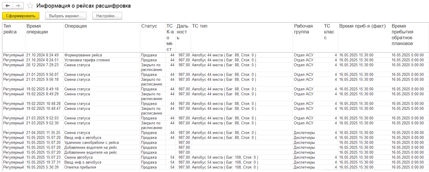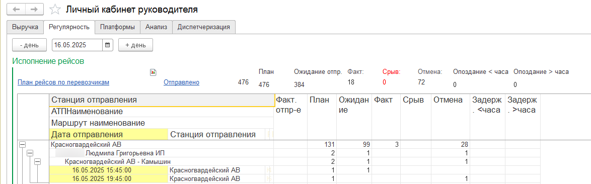 Данный отчет показывает рейсы по станциям на выбранный день: запланированные, ожидаемые к выходу, фактически вышедшие, отмененные, сорванные и те, которые отправляются с задержкой.