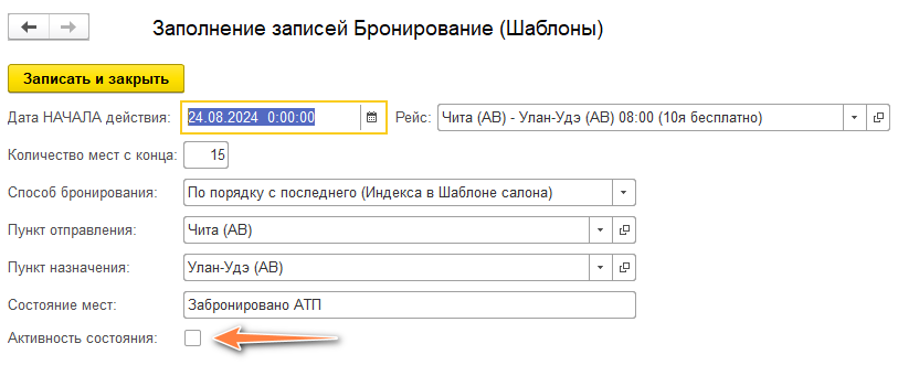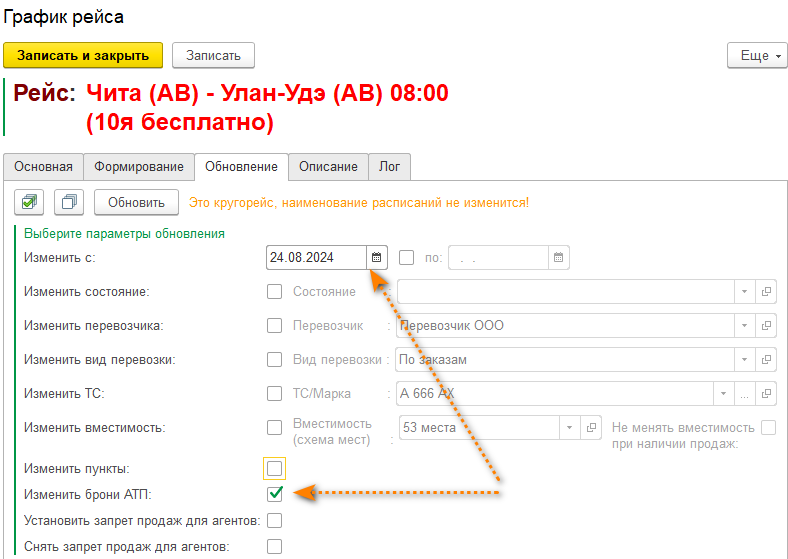 Расписания необходимо обновить по параметру "Изменить брони АТП", установить дату с которой происходят изменения. Нажмите кнопку "Обновить". Дождитесь сообщения об успешном обновлении, запишите и закройте диалоговое окно.