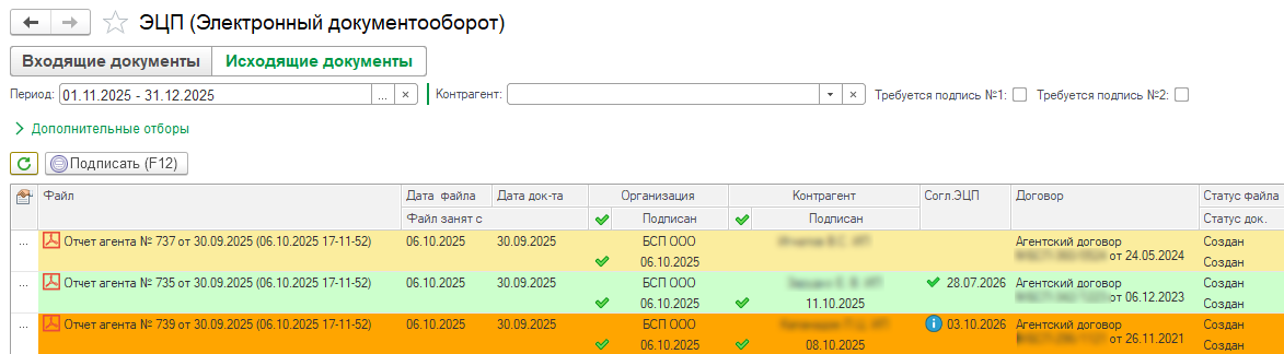 Соглашение представляет собой отдельный документ, в котором видны участники подписания, содержатся сведения о дате заключения и дате окончания соглашения, указан договор. В моменте создания документ имеет статус "Оформляемый". В разделе ЭЦП (Электронный документооборот) документы с новым соглашением имеют отметку в виде восклицательного знака и строка окрашена в оранжевый цвет.