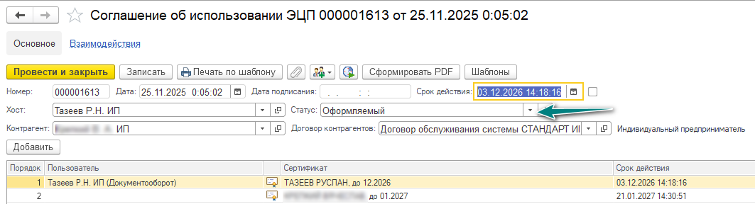 Если все данные корректны, то переведите соглашение из "Оформляемого" статуса в "Исполняемый". Строка с документом станет зеленой.