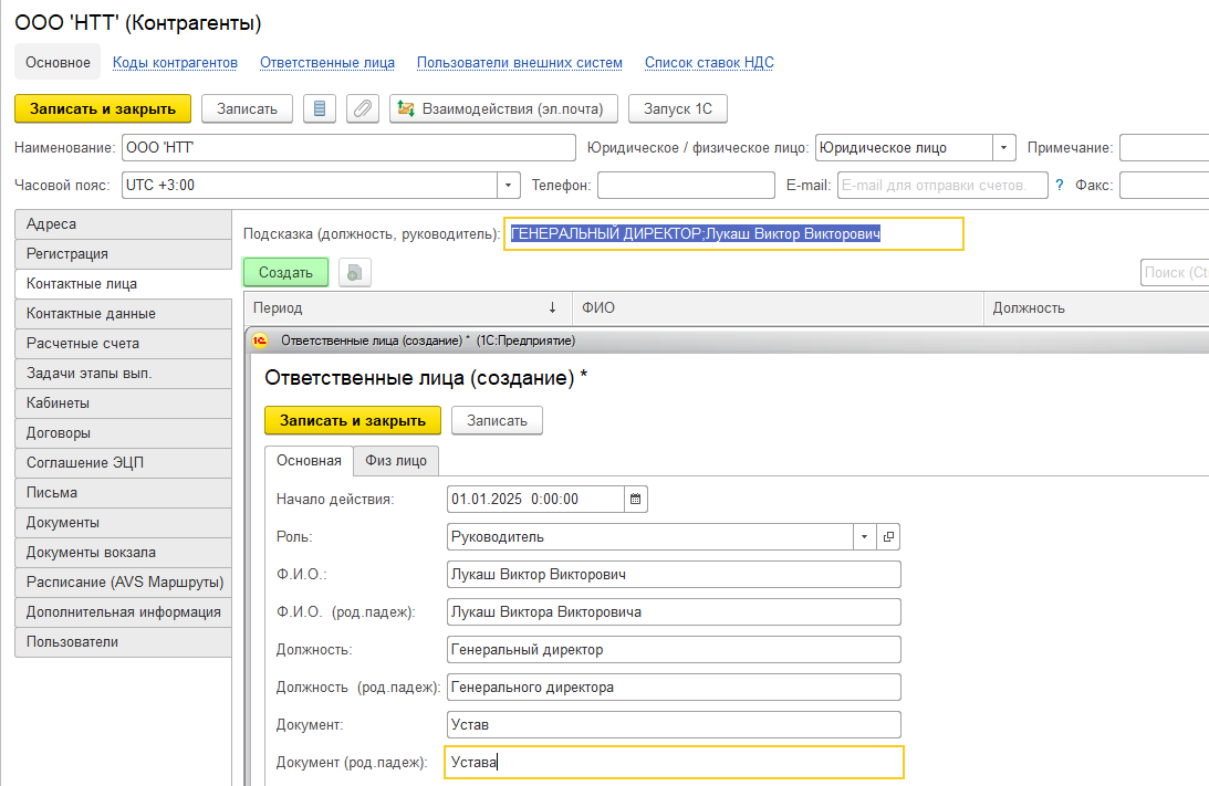 Вкладка Контактные лица будет содержать подсказку по должностному лицу. Нажмите кнопку "Создать" и заполните карточку ответственного лица.