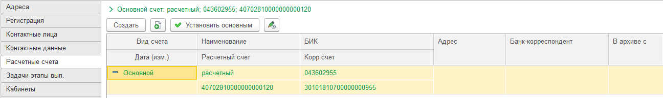 Актуальный счет необходимо установить основным. Выделите счет в списке и нажмите кнопку "Установить основным".