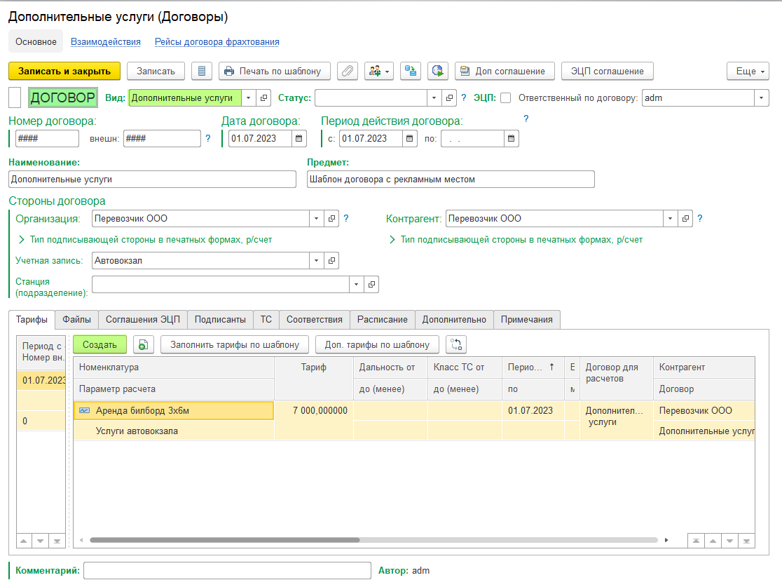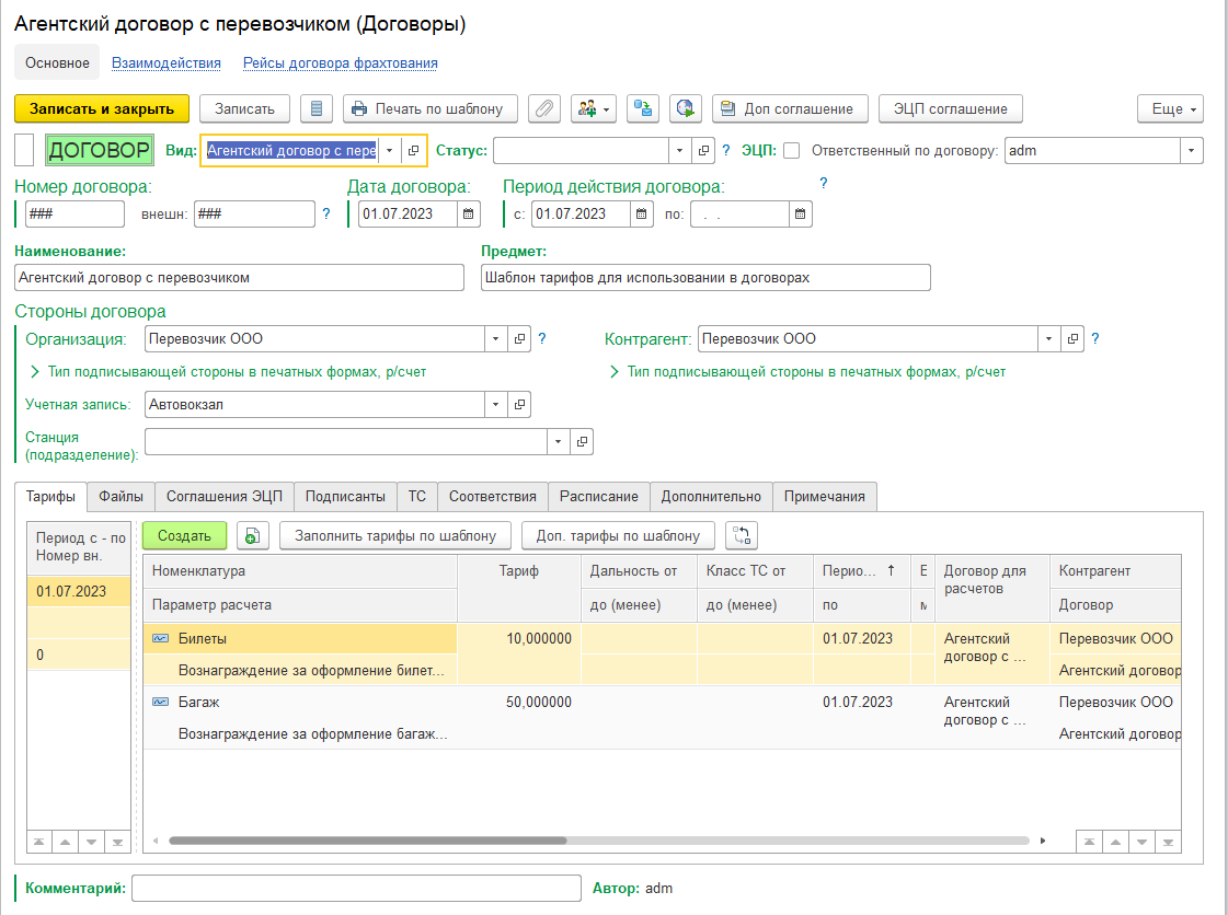 Дата договора и период действия - начиная с этого времени будет возможно использование шаблона.