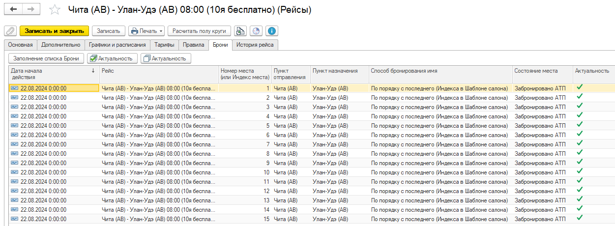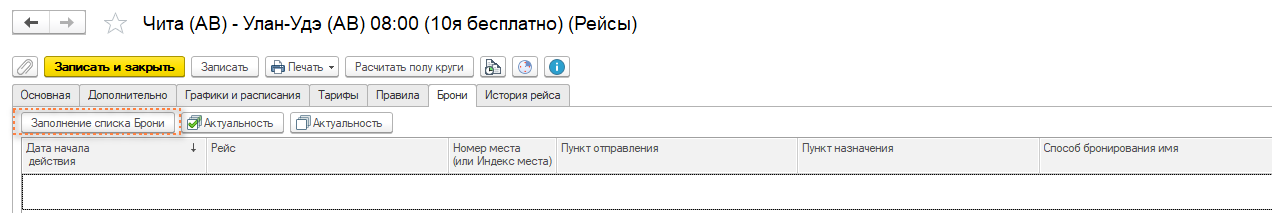 Автостанция – Рейсы – вкладка Брони – кнопка «Заполнение списка Брони»